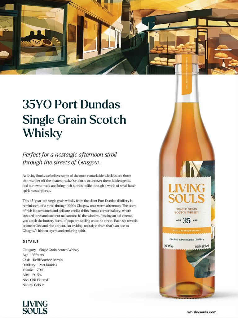 Een nostalgische wandeling door Glasgow in de jaren ’90. De stille graandistilleerderij Port Dundas leeft nog één keer op in deze 35-jarige botteling: butterscotch en vanille uit de hoekbakker, custardtaartjes en kokosmacarons in de etalage, popcorn bij de oude bioscoop. In de afdronk verschijnen crème brûlée en rijpe abrikoos – een graanwhisky met de ziel van een stad.