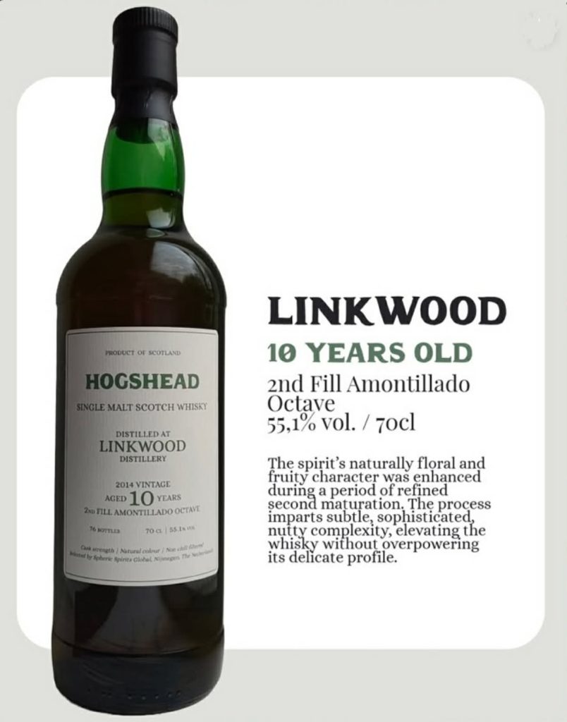 Linkwood 10yo – 2nd fill Amontillado octave: bloemig, fruitig Speyside met een zachte, nootachtige sherrytoon.