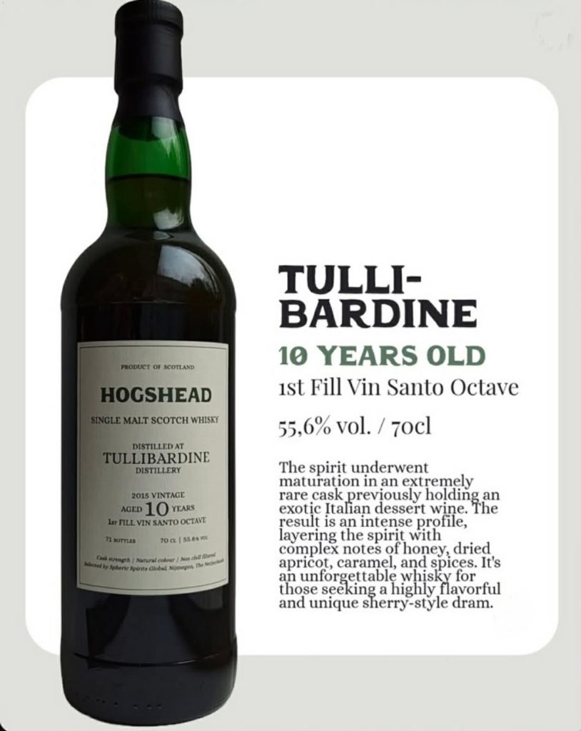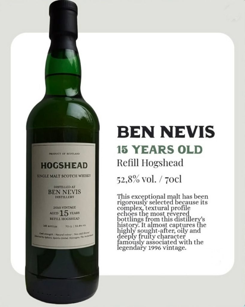 Tullibardine 10yo – 1st fill Vin Santo octave: honing, abrikoos, karamel en kruiden – modern sherry-style in een ander jasje. Voor de liefhebber van iets écht anders is er Chain Pier 5yo Virgin Oak: jonge, brutale Edinburgh city whisky van een kortbestaande distilleerderij, vol vanille, toffee, kokos en verse eik – een perfecte gesprekspartner aan de tafel. En dan nog Ben Nevis 15yo in refill hogshead: olieachtig, textuur, diep fruitig – precies de soort Highland single malt die laat zien waarom Ben Nevis zo geliefd is bij whiskynerds én gewone liefhebbers. Deze Hogshead bottelingen gaan niet over verzamelen, maar over drinken: single cask whisky, cask strength, natural colour, non-chill filtered, vol smaak voor whiskyliefhebbers, whiskydrinkers, peatheads, sherryliefhebbers en whisky geeks die hun flessen liever legen dan fotograferen. Als je houdt van single malt whisky, scotch whisky, Islay whisky, Highland en Speyside in je glas en niet in je vitrinekast, dan is deze release voor jou.