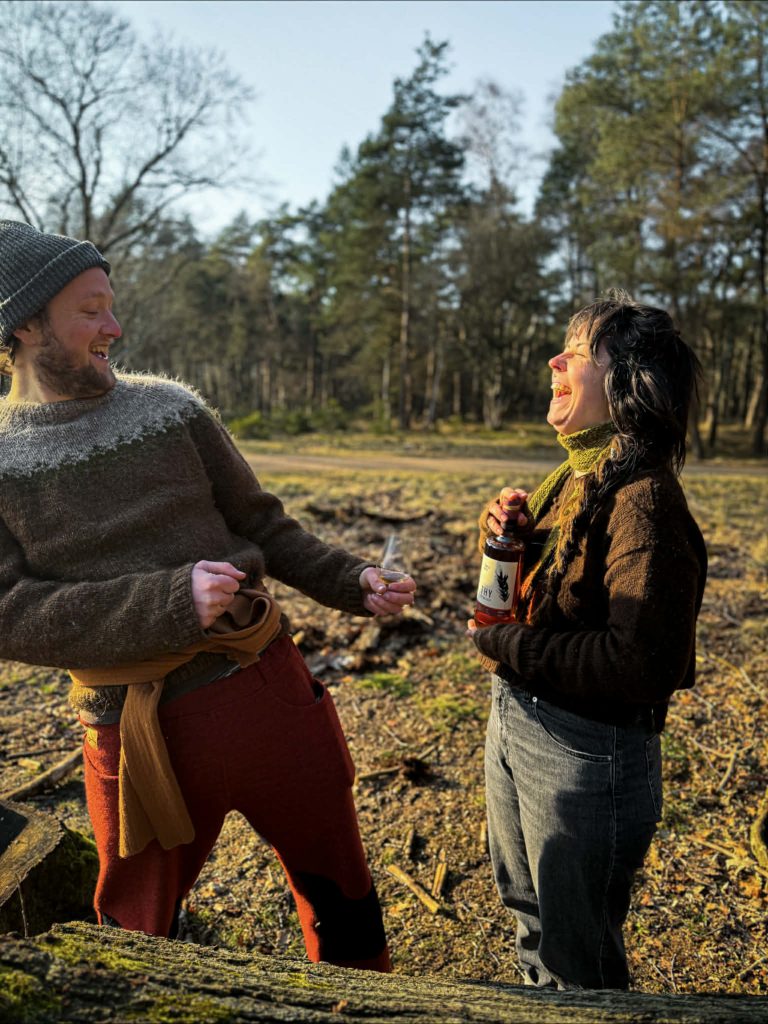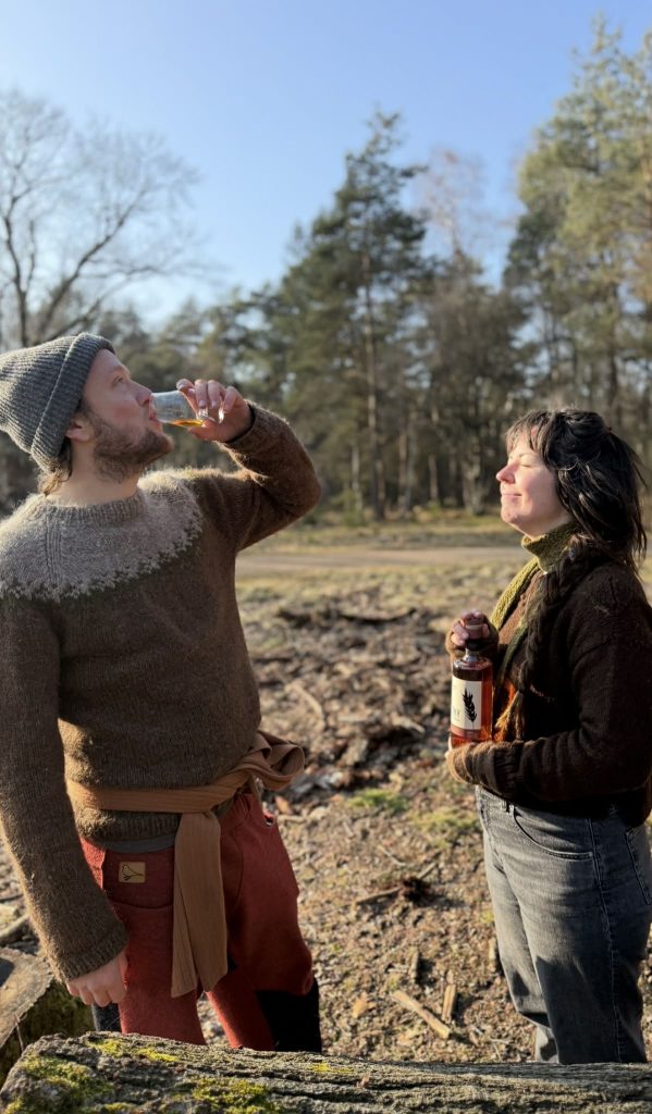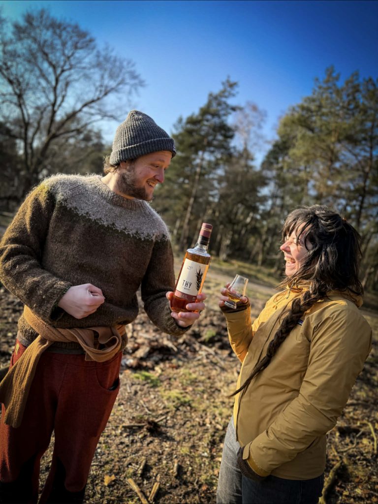 Puur toeval bracht me bij Jody en Menno. Geen planning. Geen “contentdag”. Gewoon dat klassieke moment waarop een vreemde vraagt: “Dus… wat ben je aan het doen?” Ik: “Foto’s maken van whisky.” Zij, lachend: “Natuurlijk.” Ik had een fles Thy Whisky Single Malt bij me (uitgesproken als “tu”) en dacht: als je dan toch vreemden ontmoet in het wild… dan moet je het goed doen. Dus ik vroeg of ze een klein slokje wilden proeven. Ze zeiden ja. Met hun toestemming legde ik hun reacties vast. Echte gezichten. Echt licht. Echt moment. Geen script. Gewoon whisky, winterzon en een Deense fles met z’n 15 minutes of forest fame.